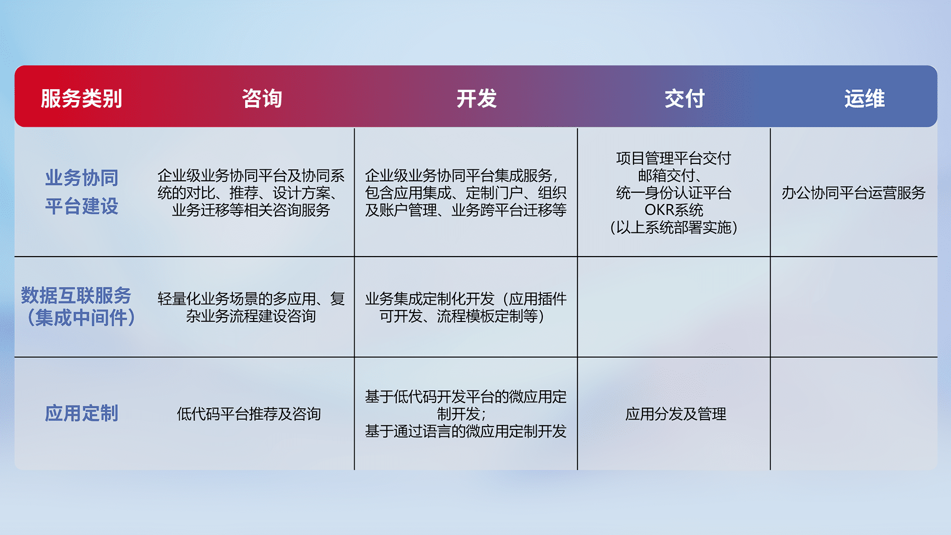 针对钉钉、、、、企微、、、IDaas等平台级产品提供产品的规划、、、、方案、、、交付、、、定制化开发等服务,,,实现如统一协同办公、、、智能客户服务、、、混合会议管理、、、智能数据查询、、、、等业务场景,,,实现数字化转型。。。